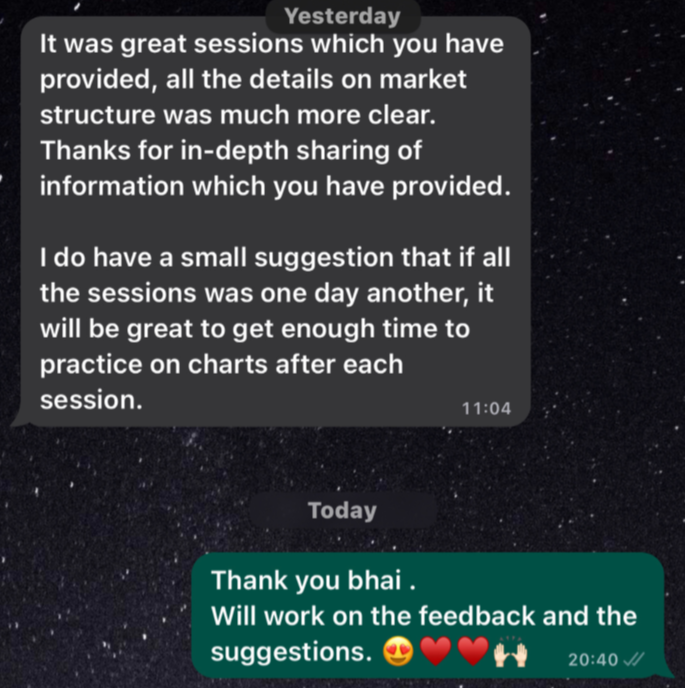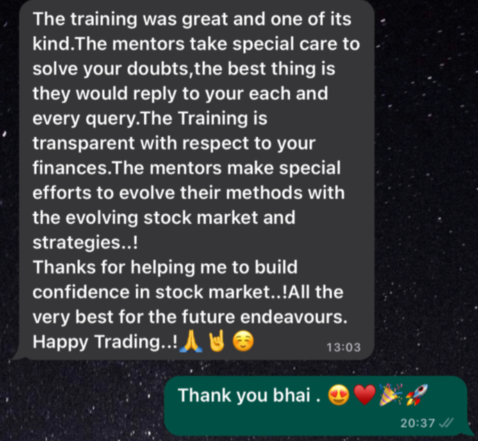 Our courses are designed for everyone, from complete beginners to intermediate traders. These courses will help you get started in the stock market and become proficient in Swing and Intraday Trading. Also our curriculum also offers specialized courses in Smart Money concepts and Algo Trading, ensuring you have all the tools and knowledge required to excel in various trading strategies. Join us to master the skills and confidence to trade independently and successfully.